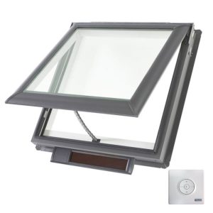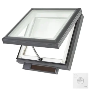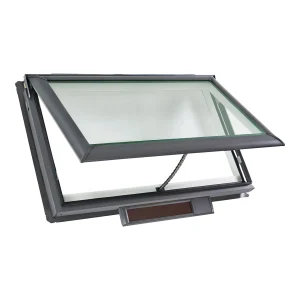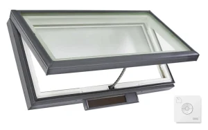 The Velux VCS solar-powered skylight is an opening skylight designed for flat or low-pitch roofs to bring fresh air and natural light into a home. It operates using a built-in solar panel that recharges a concealed battery pack, eliminating the need for an electrician during installation.